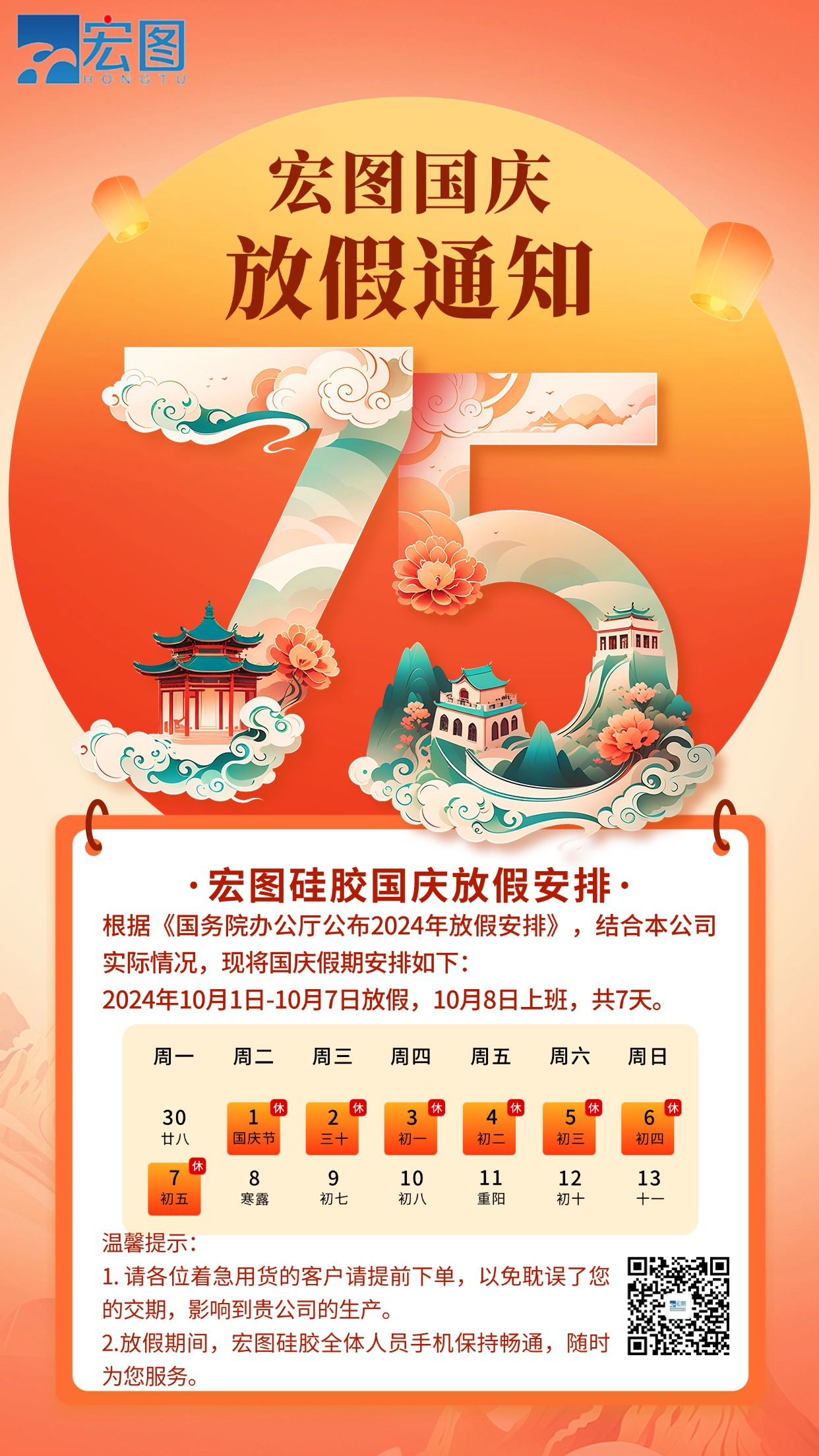 2.放假期間,宏圖硅膠全體人員手機(jī)保持暢通,隨時(shí)為您服務(wù)。